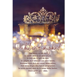 Vollständiger Text: Du bist ein Königskind. Der König ist mit dir! Er stärkt dich. Er ist dein Schutz. Er hilft dir. Er gibt dir Mut. Er umgibt dich liebevoll von allen Seiten. Niemand kann dich aus seiner Nähe reißen. Hab keine Angst. Das hat er versprochen. So achte darauf, dass du in seiner Nähe bleibst. Dann wird`s gut – alles.