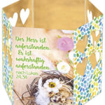 Verschenken Sie ein Licht! Diese hübsche Schachtel enthält alles, was man für einen besinnlichen, Kraft spendenden Moment braucht: Einfach Teelicht mit den Streichhölzern anzünden und in das beiliegende Windlicht stellen. Die Strahlen brechen durch die Motivstanzung und laden ein, zur Ruhe zu kommen und das wohltuende Lichterspiel zu genießen. Windlicht mit Bibelvers: Gott, wende uns deine Liebe zu und segne uns. Blicke uns freundlich an! Psalm 67,2