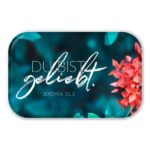 Der Magnet ist zusammen mit einem Minikärtchen in einer Folie verpackt. Auf der Vorderseite des Kärtchens ist das Motiv des Magneten zu sehen, auf der Rückseite befindet sich ein passendes Bibelzitat.