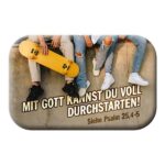 Der Magnet ist zusammen mit einem Minikärtchen in einer Folie verpackt. Auf der Vorderseite des Kärtchens ist das Motiv des Magneten zu sehen, auf der Rückseite befindet sich ein passendes Bibelzitat.
