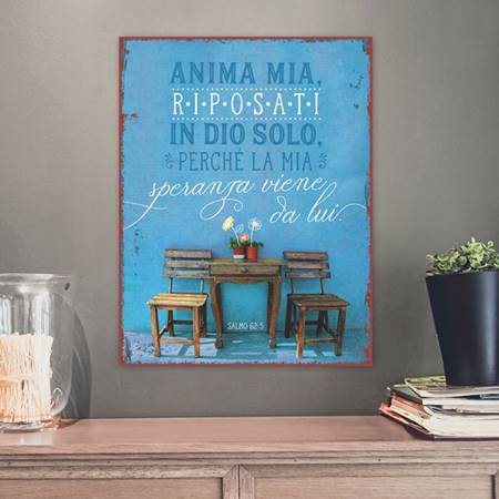 Quadro in metallo con la scritta Anima mia riposati in Dio solo, perché la mia speranza viene da lui – Salmo 62:5.
