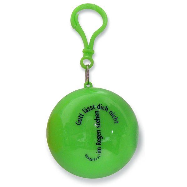 Ein originelles Geschenk: grüner Regenponcho mit Kapuze, verpackt in einer Kugel (7cm) mit Karabiner zum Umhängen, Textaufdruck: „Gott lässt dich nicht im Regen stehen“