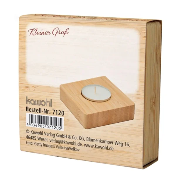 Teelichthalter aus Bambus mit Teelicht in einer gestalteten Banderole mit Widmungsmöglichkeit.