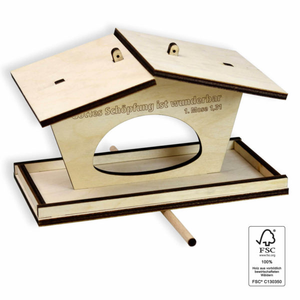 Als Futterquelle für alle heimischen Vögel: 9-teiliges Vogelfutterhäuschen aus FSC-zertifi ziertem Birkenholz zum Zusammenstecken ohne Werkzeug, inkl. Ösen zum Aufhängen (Befestigungsmaterial nicht enthalten). Auch zum Verschicken geeignet, mit Lasergravur „Gottes Schöpfung ist wunderbar“.