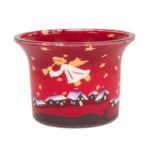 Engel mit Posaunen und viele Sterne „leuchten“ über dem verscheiten Winterdorf. Dieses rote Votivglas schafft heimelige Atmosphäre an dunklen Wintertagen.